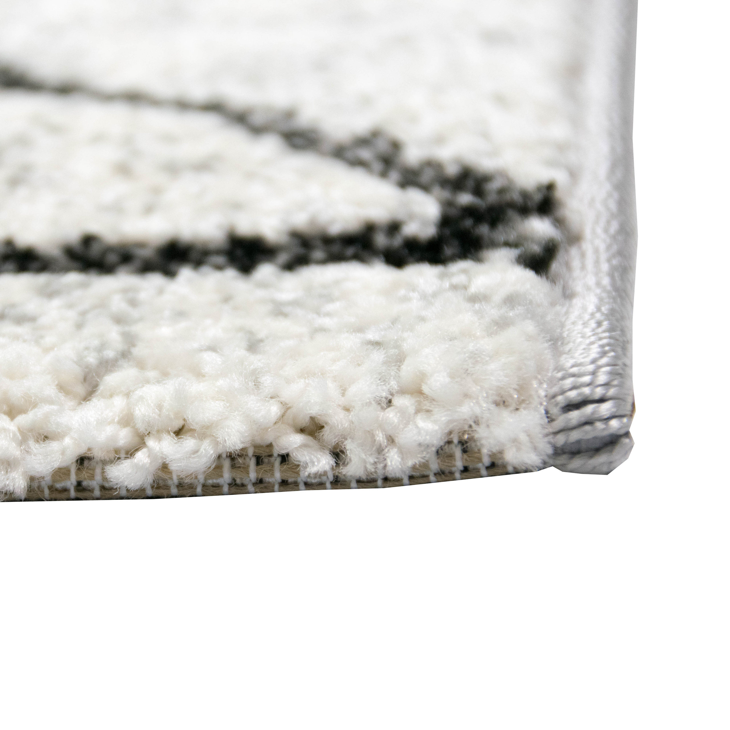 Der gewebte Wollteppich überzeugt durch seine hübsche, grafische Musterung.