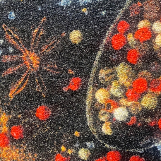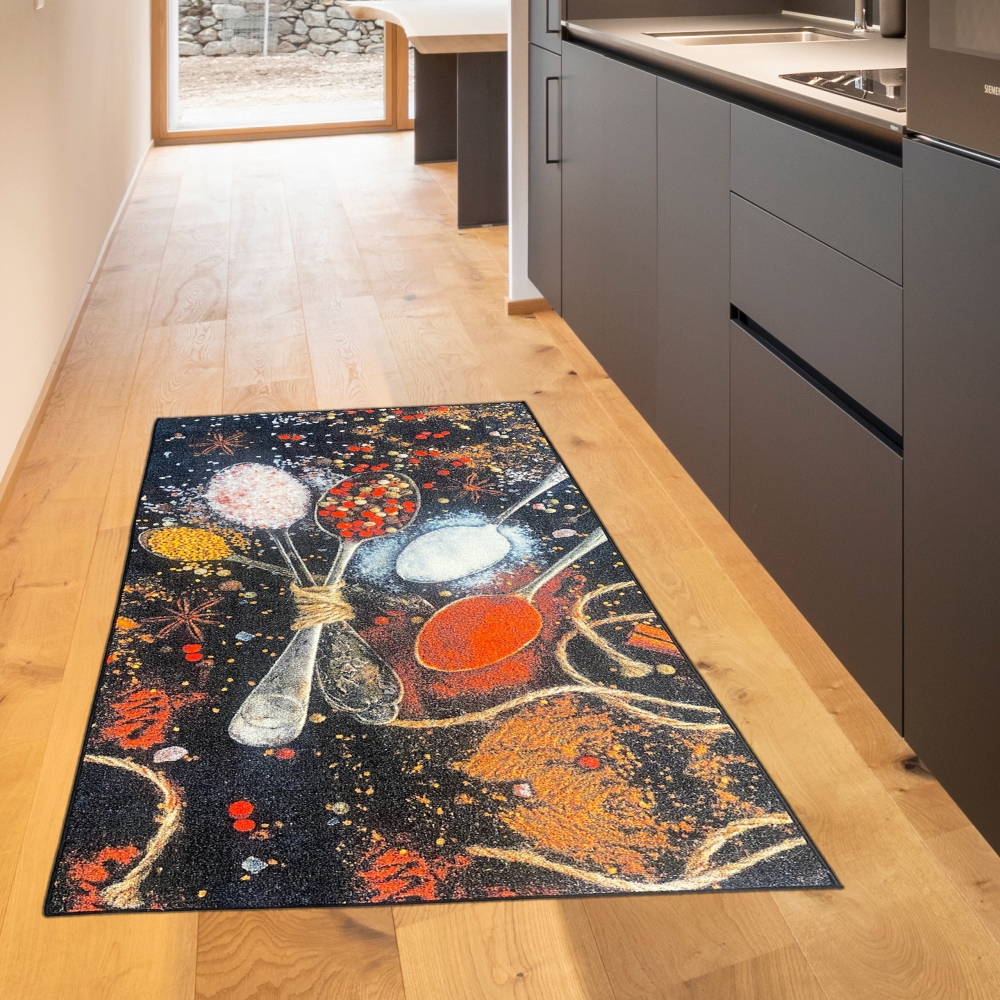 Ein spannender Designer Teppich mit inspirierenden Gewürzen: Senf, Paprika Cayenne Pfeffer und Salz in gelb-roten Farben auf dunklem Hintergrund. Passend zur Küche, wo öfters mal geputzt werden muss, kann dieser Teppich einfach in die Waschmaschine geworfen werden! Zudem hält er besonders lang und ist auch rutschfest um Unfälle zu verhindern. Das farbenfrohe Kunstwerk, welches zum Kochen inspiriert und eine lebendige Atmosphäre schafft, tut sich gut als Deko in Küche oder Esszimmer, aber auch unterm Esstisch im Wohnzimmer! Ebenso für überdachte Außenbereiche geeignet, bspw. zum Grillen (wenn der Läufer nass wird, einfach zum Trocknen aufhängen).