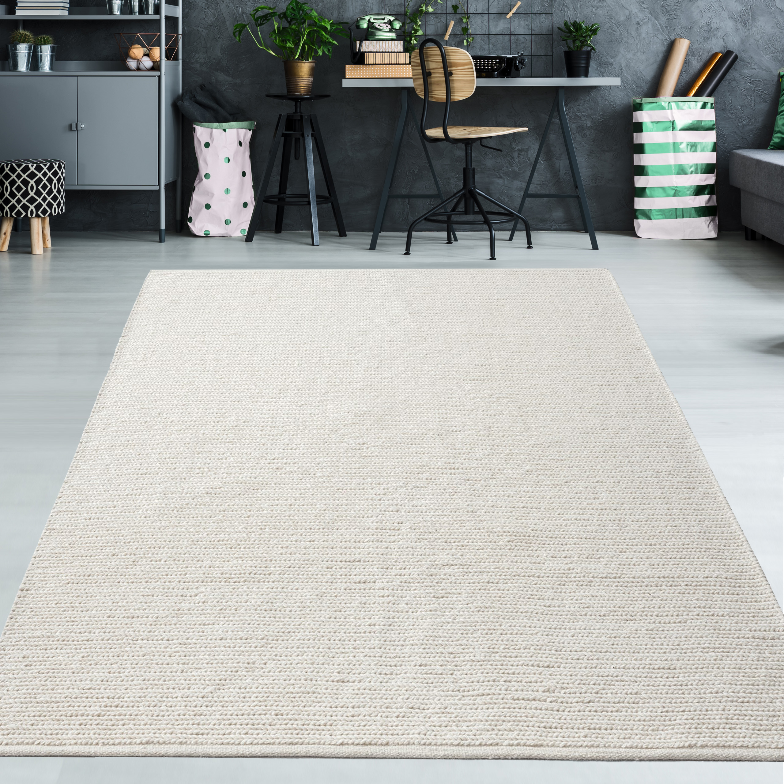 Erleben Sie die zeitlose Eleganz unseres handgewebten Teppichs in Creme. Hergestellt aus einer sorgfältig ausgewählten Mischung von Wolle und Baumwolle, bietet er nicht nur einen strapazierfähigen Bodenbelag, sondern auch vielseitige Nutzungsmöglichkeiten. Das ansprechende Uni-Design fügt sich nahtlos in jeden Raum ein und verleiht Ihrem Zuhause einen Hauch von Raffinesse.