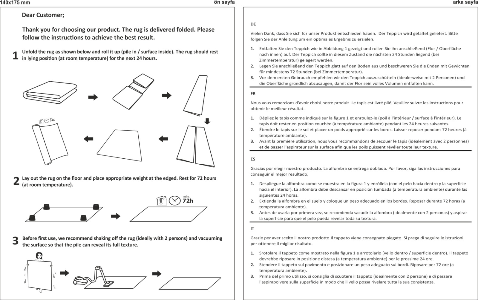 Verpackung: Die Größen 80 x 150 cm und 80 x 300 cm werden gerollt geliefert, alle weiteren Maße werden sorgfältig gefaltet verpackt.
