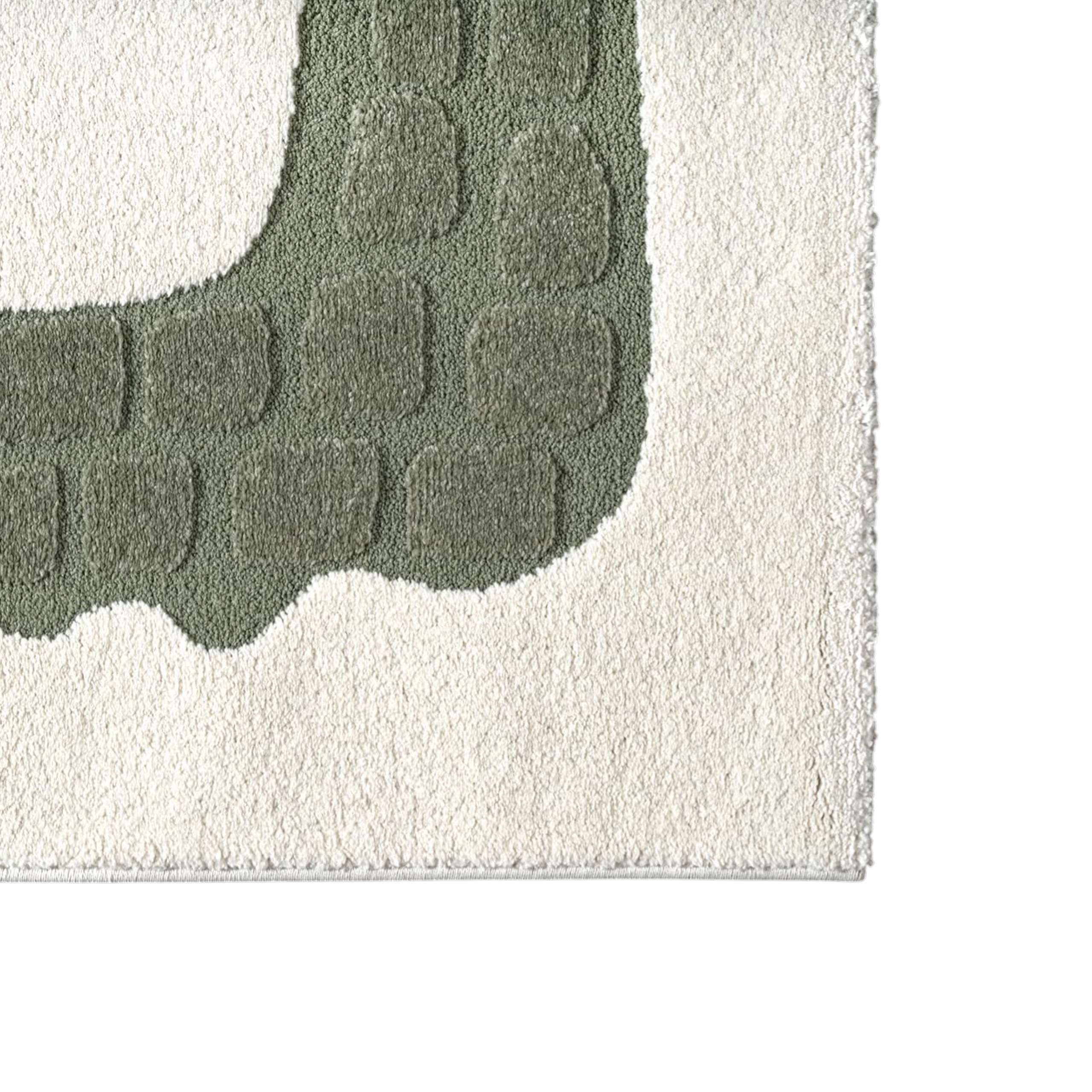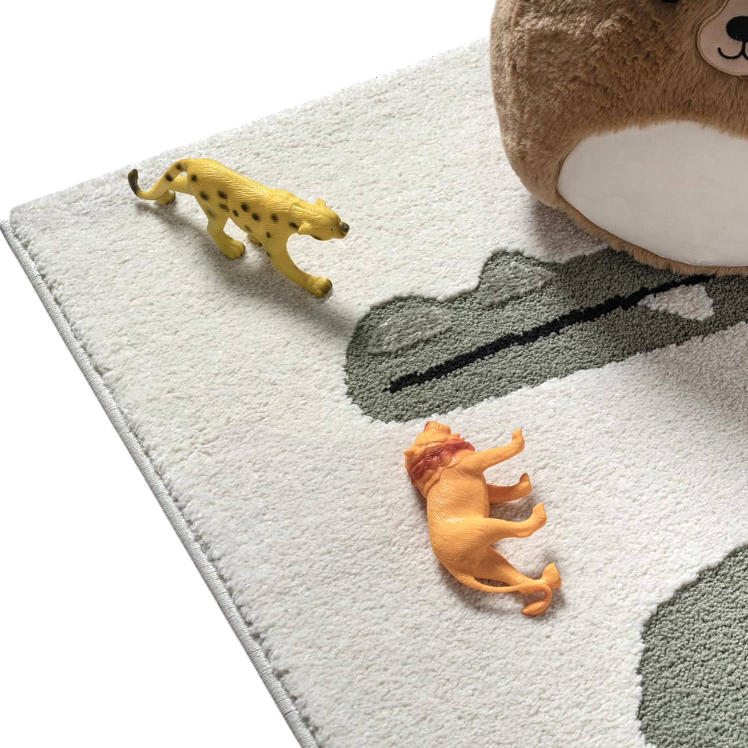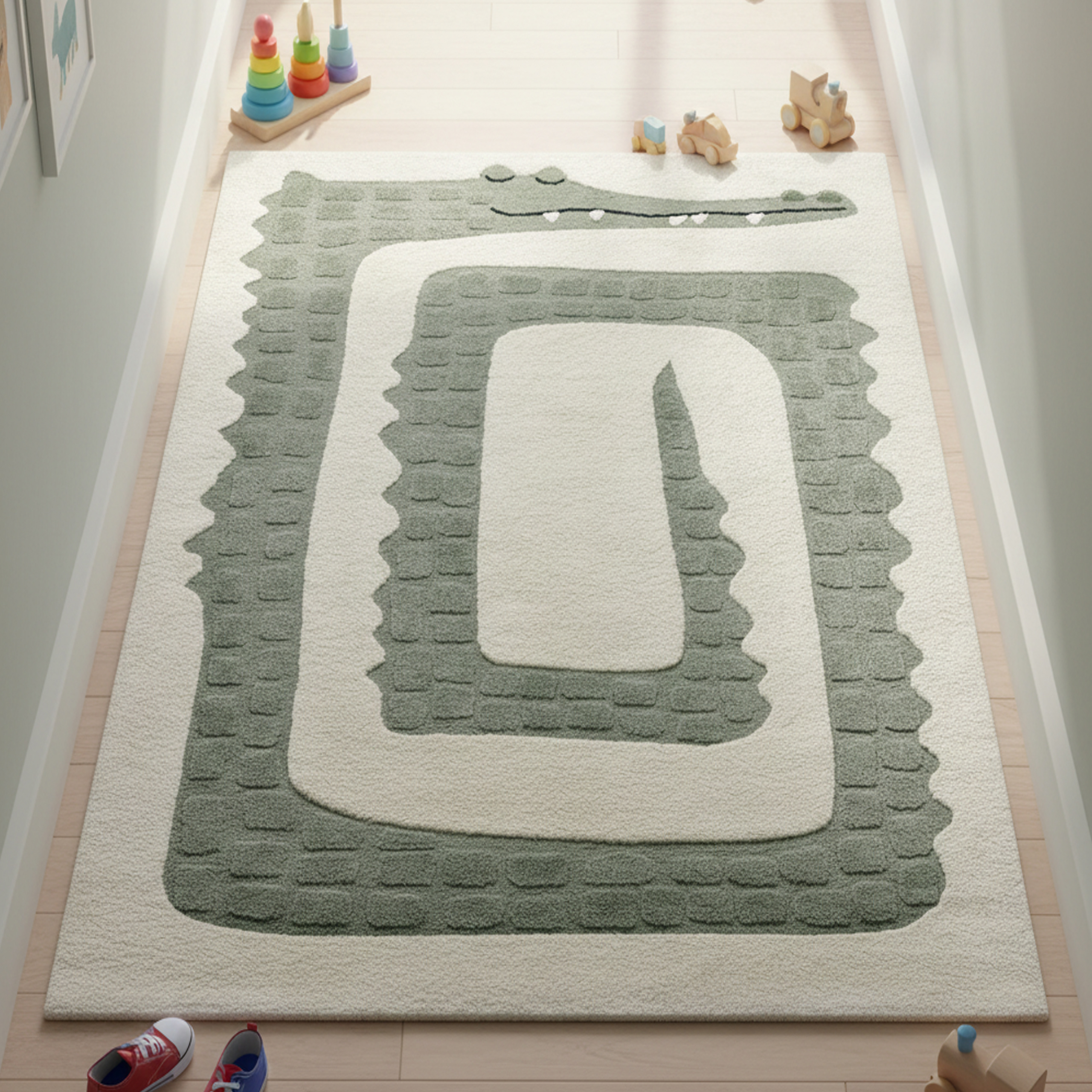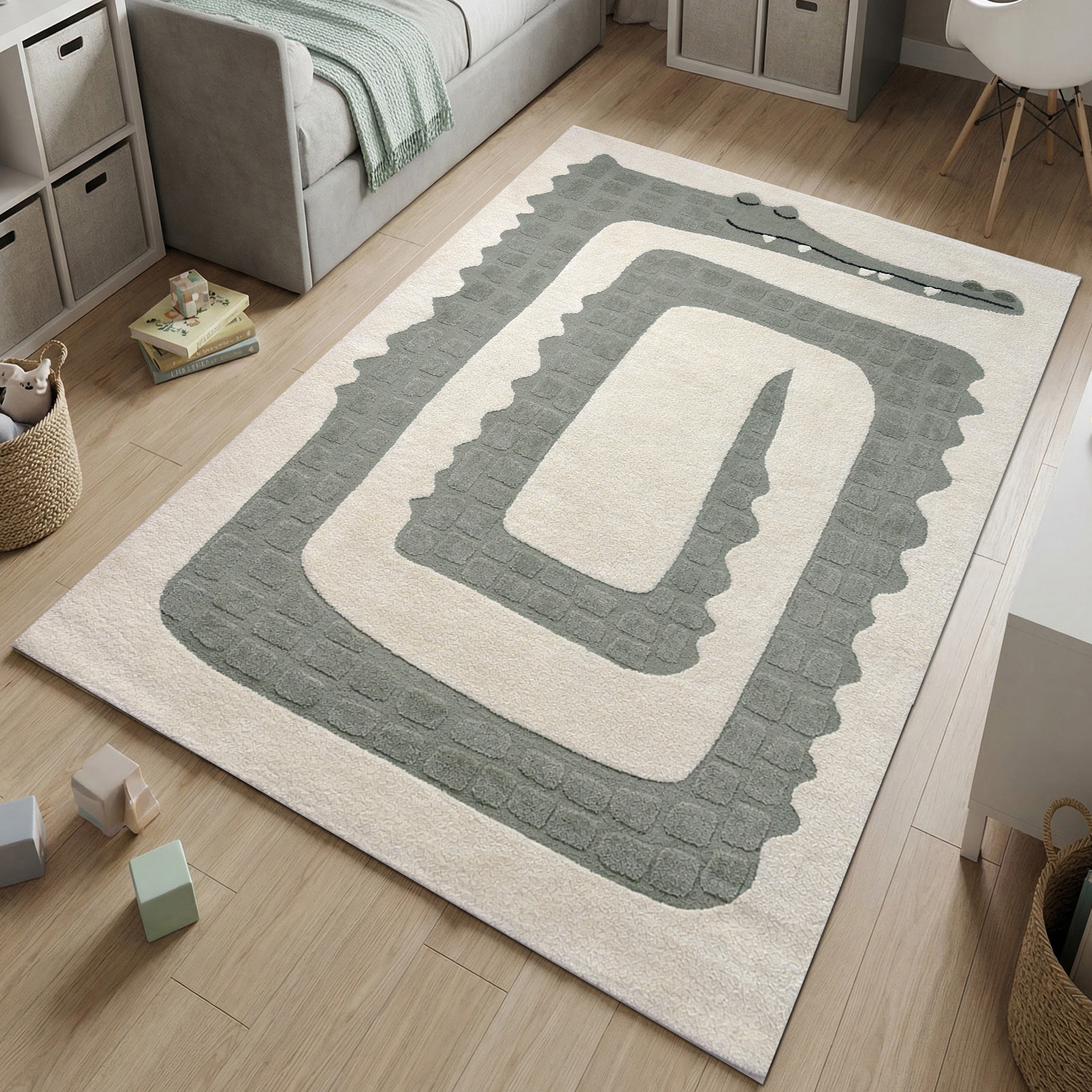 Moderner Kinderteppich mit stilisiertem Krokodil-Design in sanften Grün- und Cremetönen. Das ruhige und minimalistische Motiv sorgt für eine harmonische Atmosphäre und fügt sich perfekt in jedes Kinderzimmer ein.