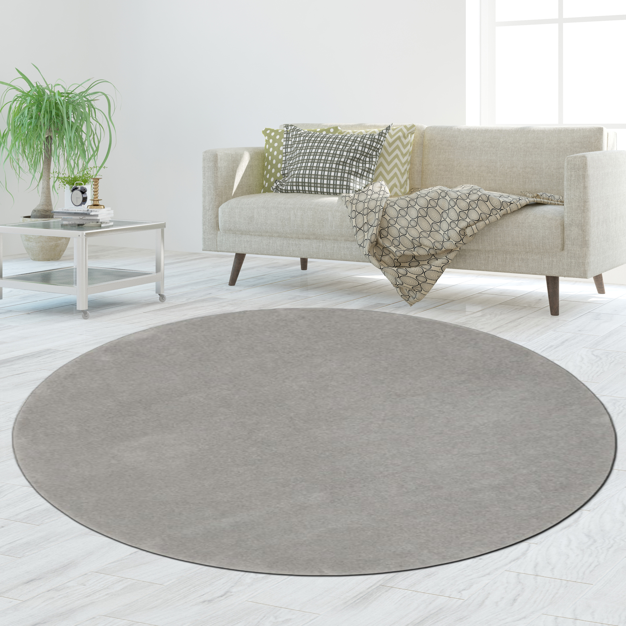 Der Teppich in Silber ist ein praktischer, moderner Begleiter für Alltag, Familie und Haustiere.